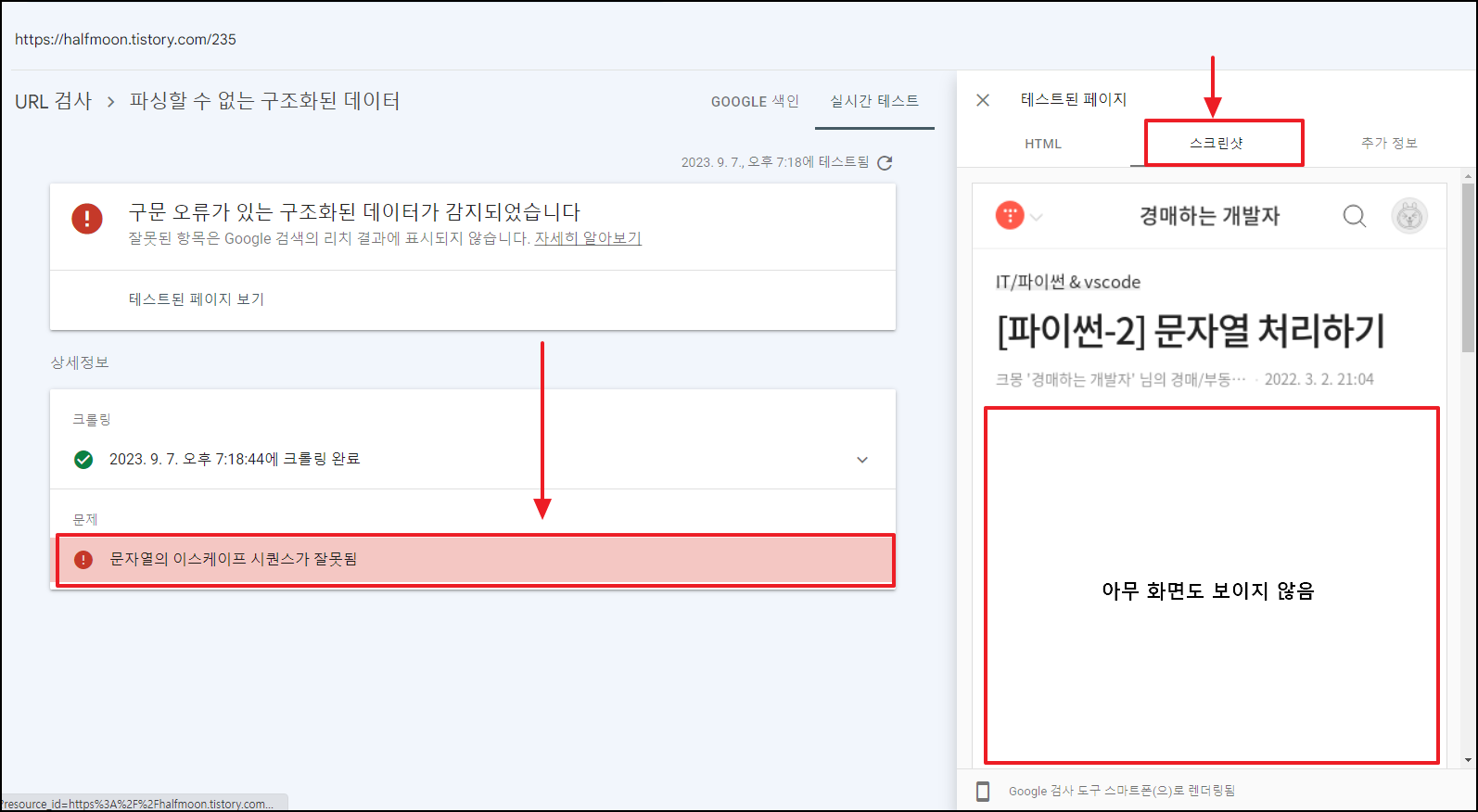 [구글 리서치콘솔] '문자열의 이스케이프 시퀀스가 잘못됨' 오류 해결법 구글 콘솔에서 개선사항 탭을 보니 아래와 같이 특정 글에 구문 오류가 있다는 경고창이 떠있었다. 위와 같은 에러가 뜬