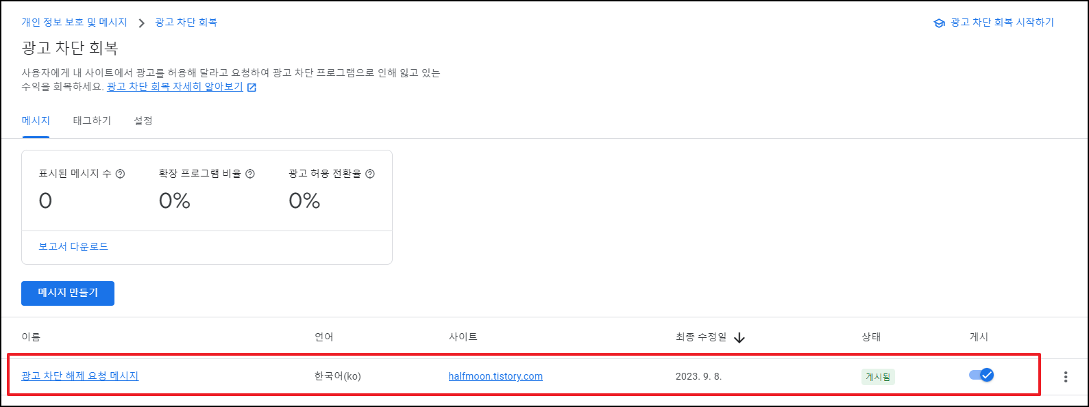 생성 절차가 완료되니, 광고 차단 해제 요청 메시지가 생성되었고 자동으로 잘 게시가 되고 있음을 확인할 수 있다.