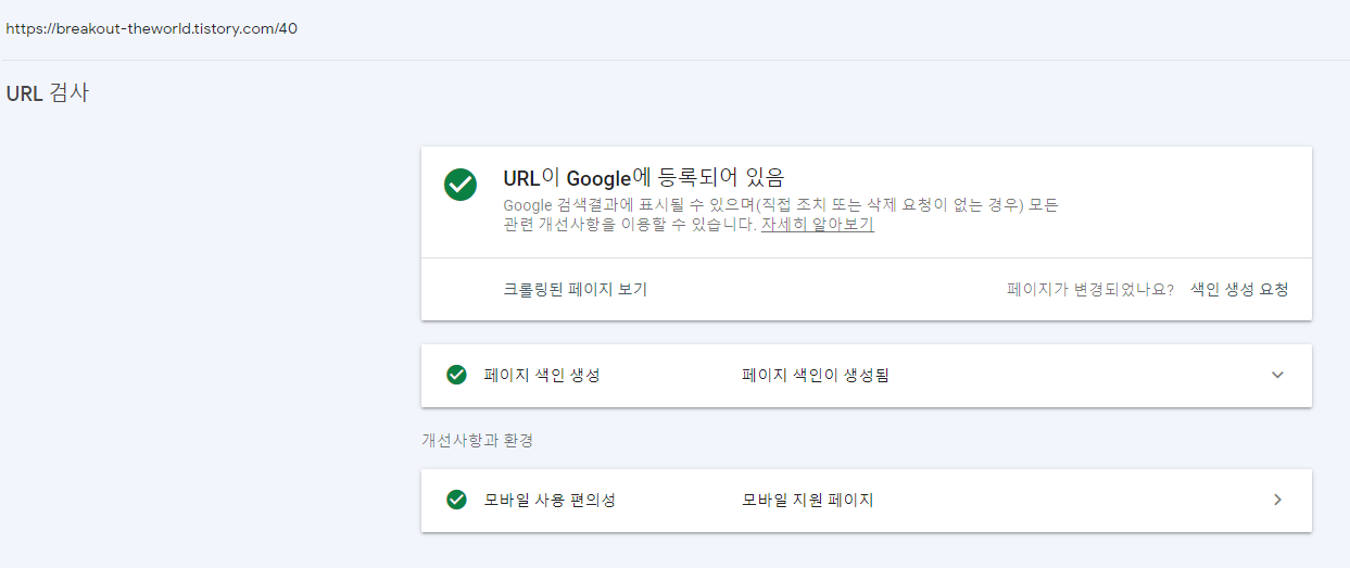 URL검사를 할 수 있고, URL이 구글에 등록됨을 확인할 수 있습니다.