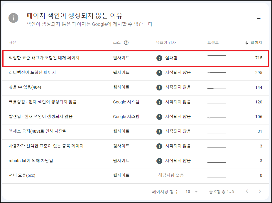 이 오류에서는 이전 오류들과 마찬가지로 리디렉션 또는 대체 URL이 있는 페이지는 괜찮지만, '색인 생성에 실패한 표준 URL'을 찾는것이 중요하다.
