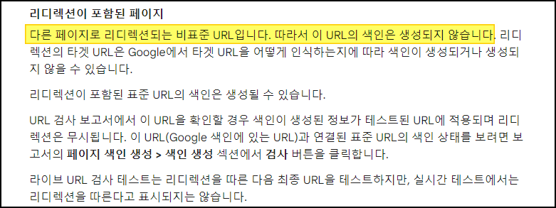 ①항목과 마찬가지로, 리디렉션이 포함된 페이지 또한 표준 URL이 정상적으로 색인이 된다면 큰 문제가 없다.