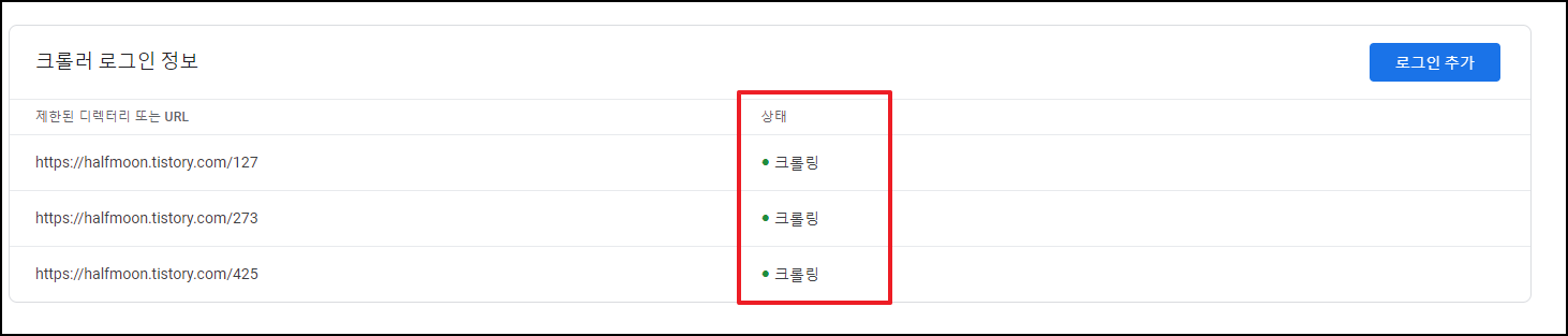 첫 번째 크롤링 문제가 발생한 URL을 입력하고, 두 번째에는 로그인하는 페이지를 넣으면 됩니다.. 두 번째 로그인하는 페이지에 대한 설명이 대부분 글에서 정확하지 않고, 여러 가지를 알려주는데 「https://www.tistory.com/auth/login」를 사용해도 되고, 티스토리에서 로그아웃을 하면 길게 나오는 주소를 사용해도 됩니다. 실제로 다 테스트를 해보았습니다.