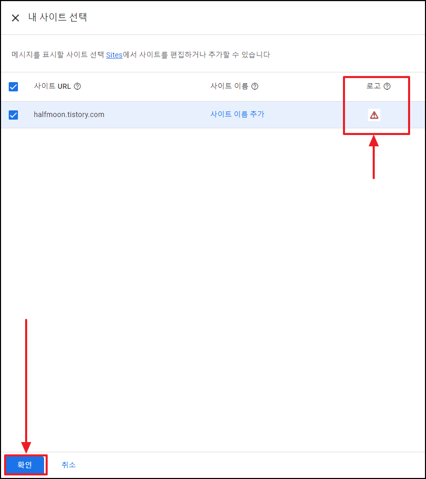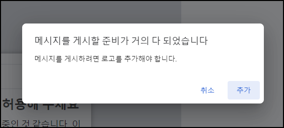 '게시' 클릭하고 나니 메시지에 로고가 없어서 추가해야 된다는 팝업이 떴다. (로고를 추가하지 않으면 메시지 설정이 불가하다.)
