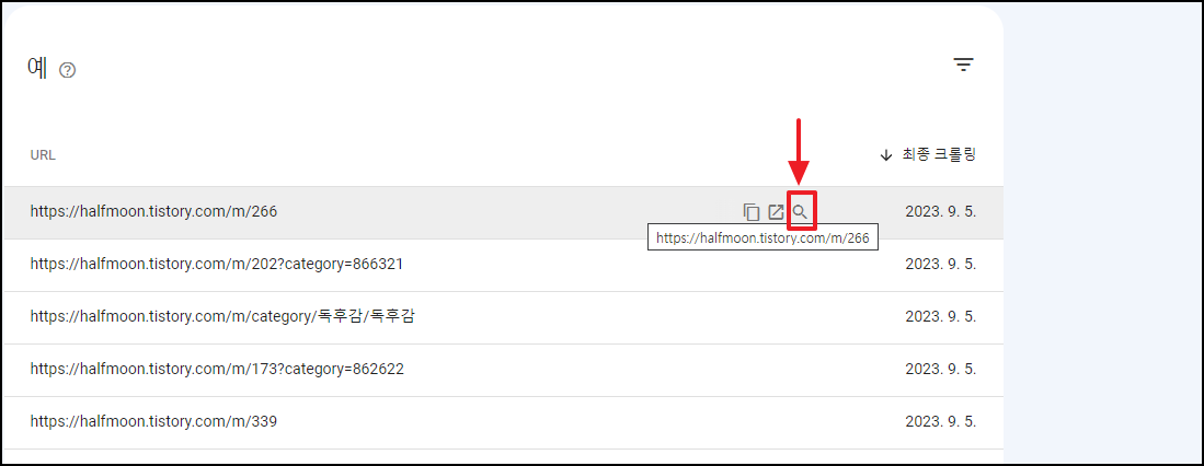 대표 URL이 색인 생성이 잘 되는지 여부를 확인하기 위해서는 마우스를 갖다대면 나오는 돋보기 모양을 클릭한다.