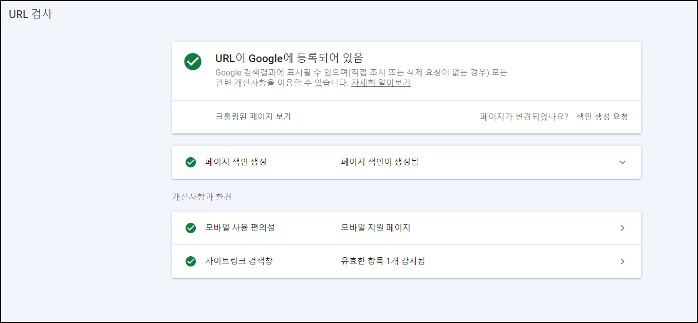URL 검사 결과, 메인 페이지만 보면 URL이 구글에 잘 등록되어있으며, 페이지 색인도 정상적이고 모바일 편의성이나, 사이트리크 검색도 유효한 것처럼 보인다.