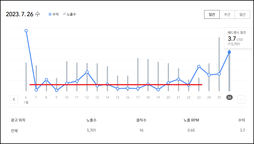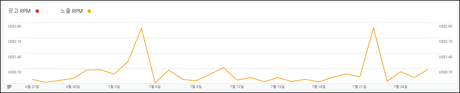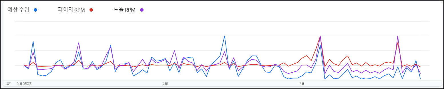 ① 광고 RPM과 노출 RPM은 완전히 같은 값이다. (겹쳐져서 안보이는 것이다.) 앞으로 광고 RPM은 표시하지 않고 노출 RPM만 표시하겠다.