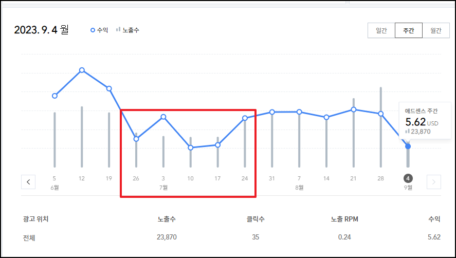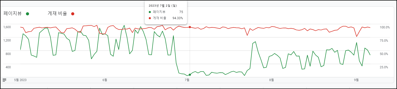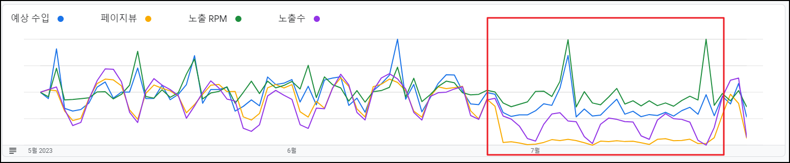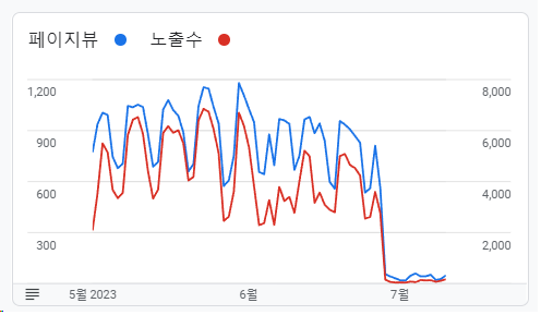 이 3개월 시계열에서 페이지뷰를 추가하니 문제가 명확하게 정의되었다. 수익급감이 있었던 지난 2주간 구글 애드센스를 통해 확인된 페이지뷰가 현저하게 떨어진 것을 알 수 있었다. (정확하게는 6월 23일부터 7월 23일까지 페이지뷰가 급감함)