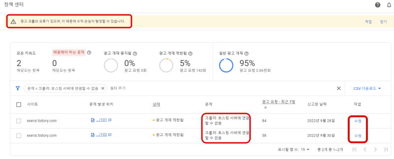 구글 애드센스 홈페이지 접속 시 상단에 오류 알림 창 표시됨