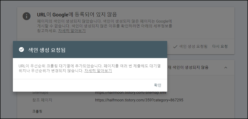 색인을 요청하고 나면, 아래와 같은 '색인 생성 요청 완료' 메시지가 뜨고 몇 시간(또는 몇 일) 기다리면 색인 생성에 성공하게 된다.