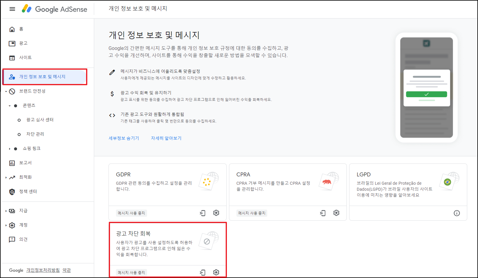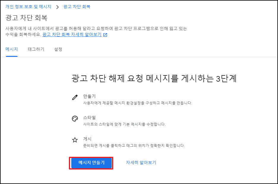 개인 정보 보호 및 메시지 탭 클릭 - 광고 차단 회복 클릭