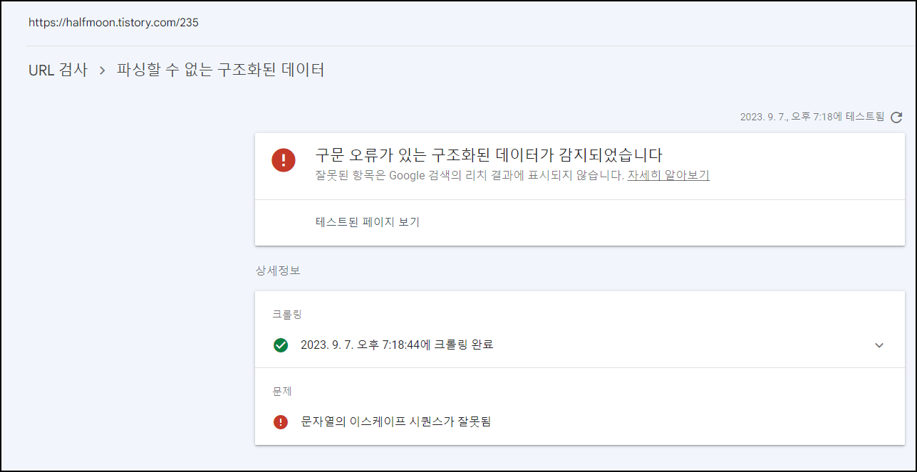 (추가) URL 실시간 검사 중 '구문 오류가 있는 구조화된 데이터가 감지되었습니다' - '파싱할 수 없는 구조화된 데이터' - '문자열의 이스케이프 시퀀스가 잘못됨' 오류가 추가로 발생하였다.
