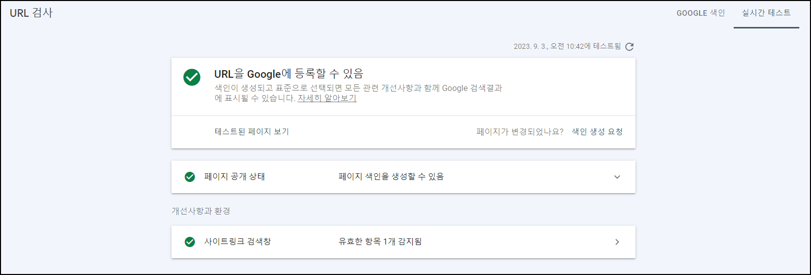 결과페이지 우측 상단에 '실제 URL 테스트'를 진행해보았다. 기본 URL 검사와의 차이점은 URL검사는 오직 GOOGLE 색인(Index) 정상 생성 여부만 확인하는 데 반해, 실시간 테스트는 직접 매크로가 URL을 접속해보며 정상여부를 확인하는 절차이다. 이 또한 정상으로 보인다.