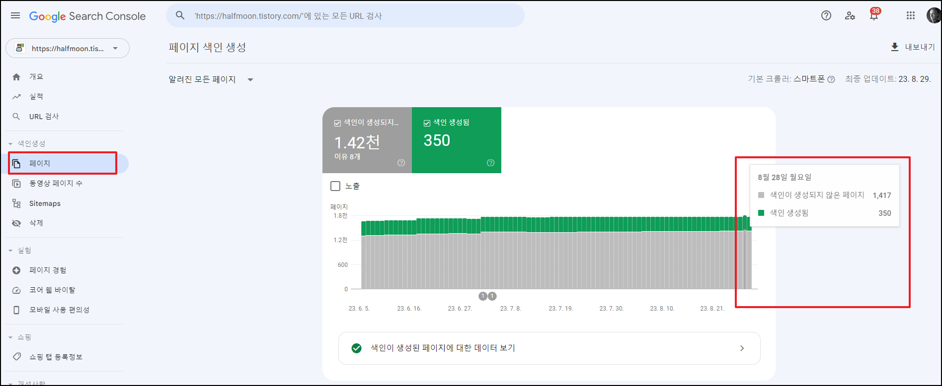 그러나.. 색인생성 - 페이지를 보니 최근까지도 색인 생성이 실패된 페이지가 무려 1,400개에 반해 색인이 정상적으로 생성된 건은 350개밖에 되지 않았다. 색인이 되지 않으면 구글에서 나의 글이 검색되지 않는다. 해결방법은 결국 수동 색인 신청을 해야 한다.