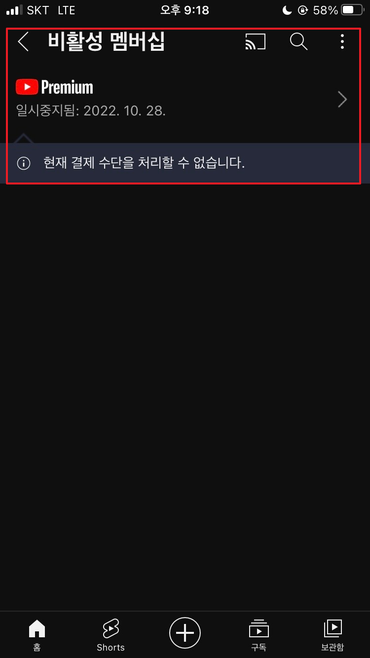 유튜브 프리미엄 '가족 멤버십 일시중지됨' 해결 방법 (+카드 결제 실패)