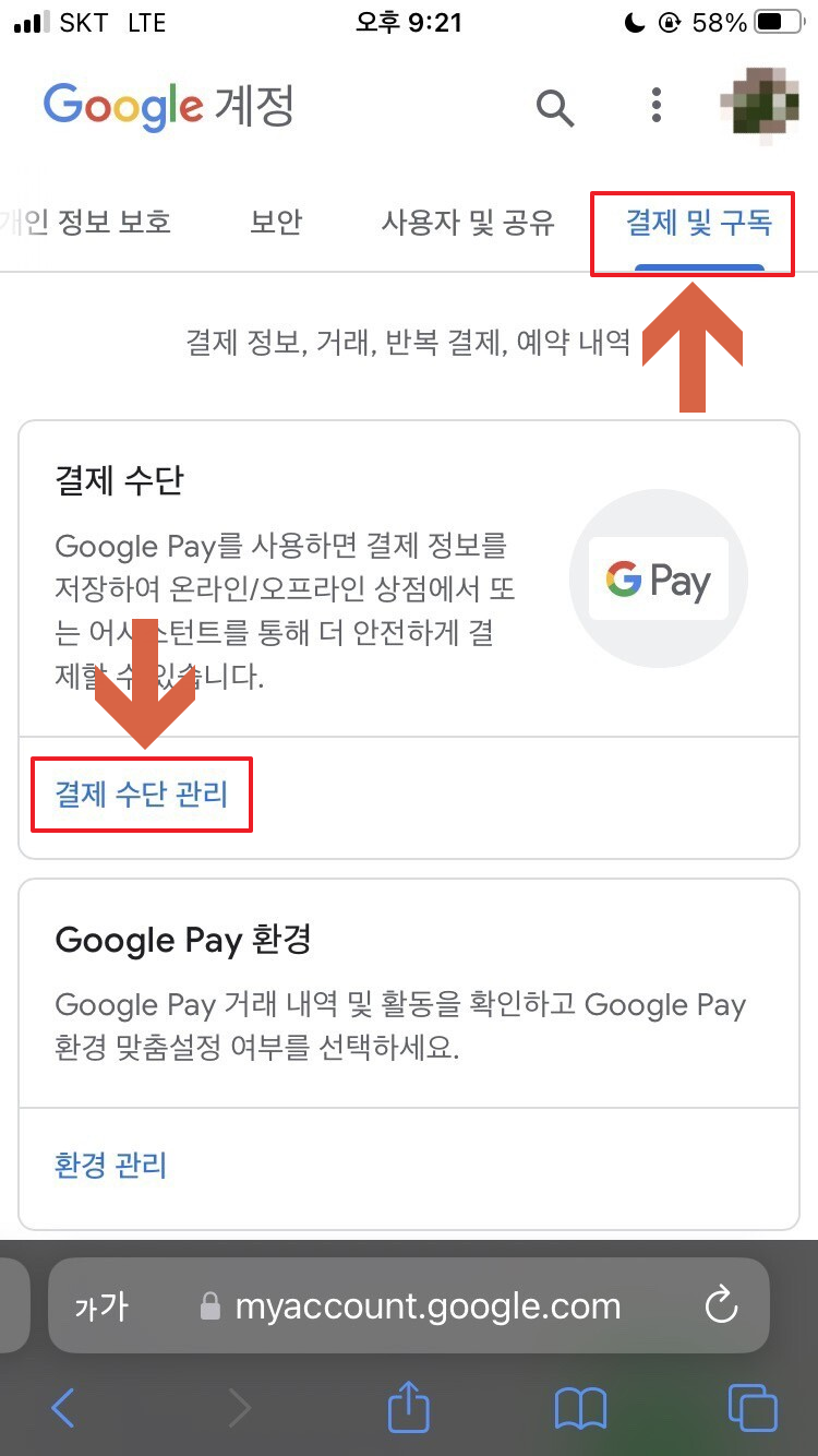 2. 상단 메뉴 중 “결제 및 구독” - 결제 수단 관리 클릭