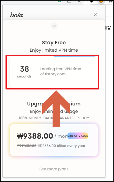 ※ 아래와 같이 종종 50초 Loading 후 Limited VPN(시간제한형 VPN, 무료)을 사용할 수 있기도 한다.