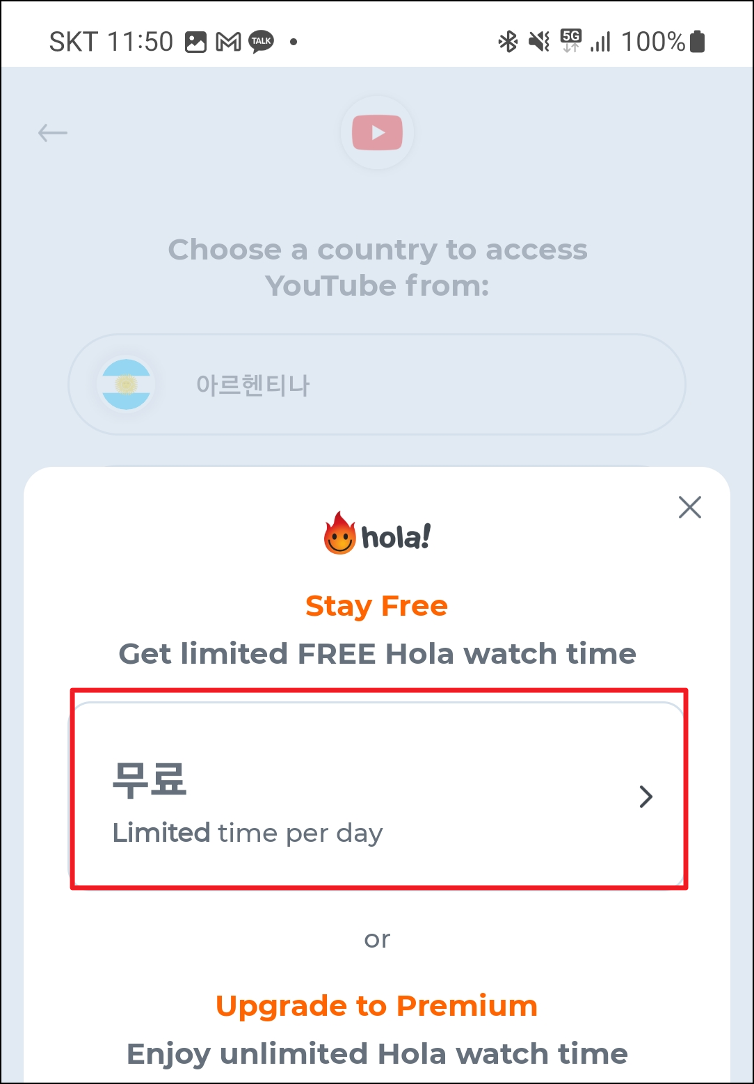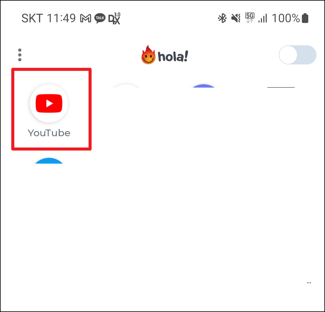 2-1) 모바일의 경우 : Hola VPN 어플 실행 - 유튜브 어플 클릭