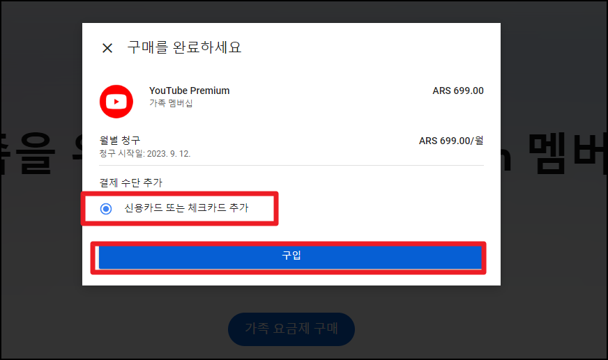 3-4) PC의 경우 : 신용카드 또는 체크카드 추가 클릭 - 구입 클릭