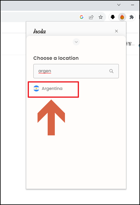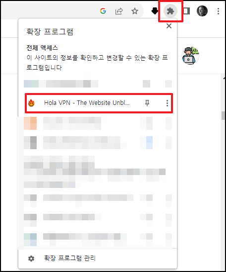 2-1) PC의 경우 : 크롬 우측 상단에 Hola VPN 확장 프로그램 클릭