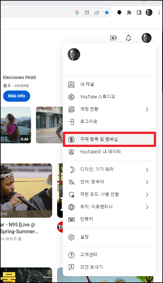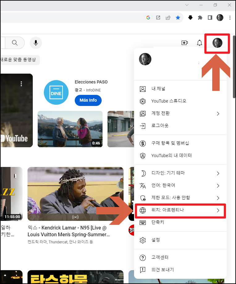 3-1) PC의 경우 : 유튜브 홈페이지 우측상단 얼굴 클릭 - '위치:아르헨티나' 확인