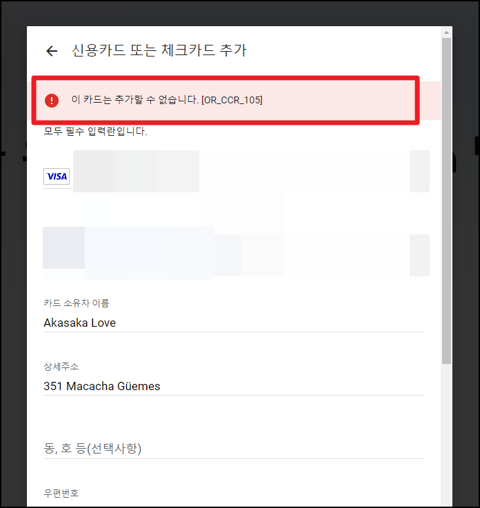 이 카드는 추가할 수 없습니다. [OR_CCR_105] 에러 발생