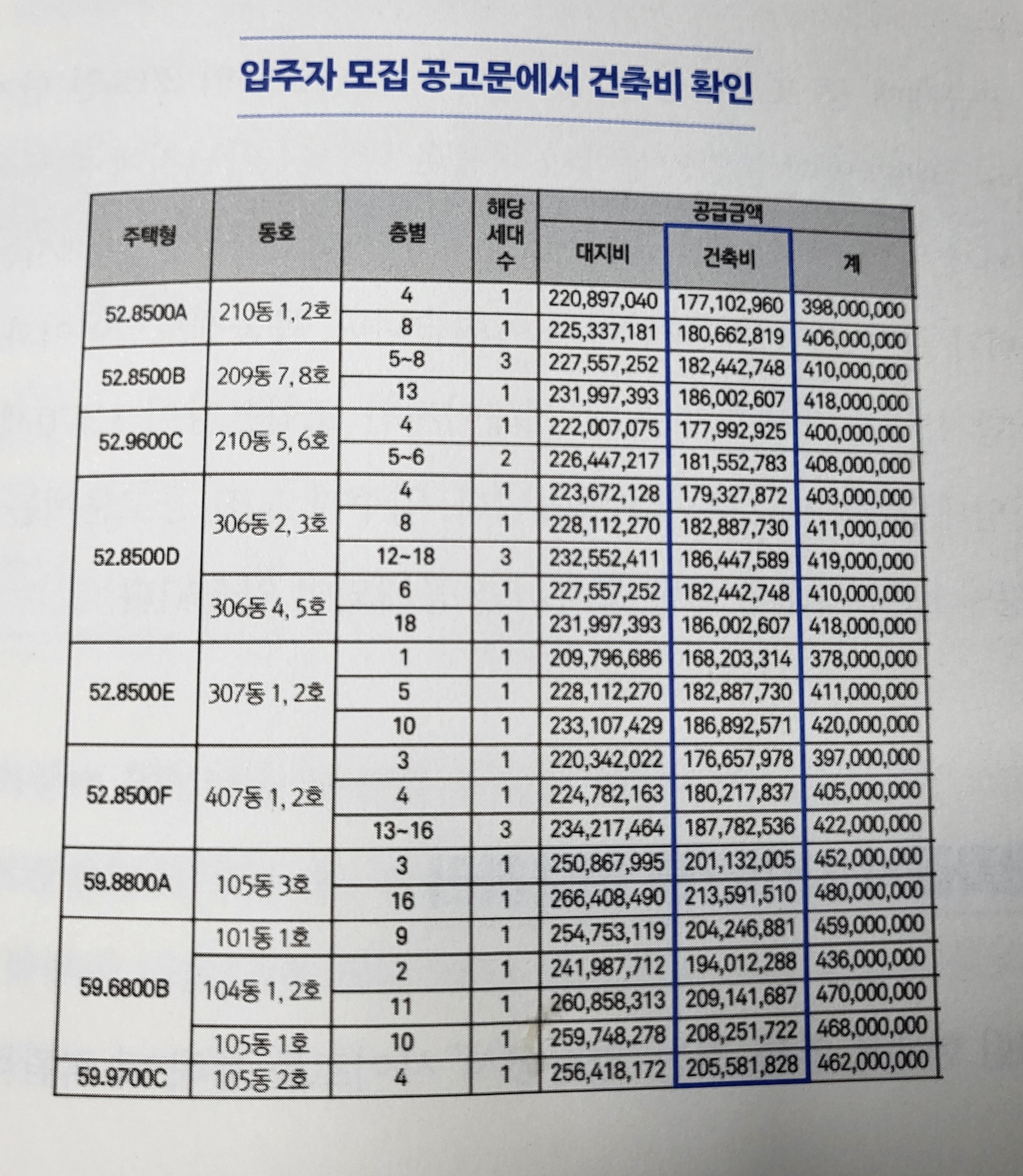 입주자 모집공고문(일반분양)에서 발췌한 세대당 평균 건축비는 3.5억으로 5천만 원이나 차이가 나는 것을 알 수 있다.