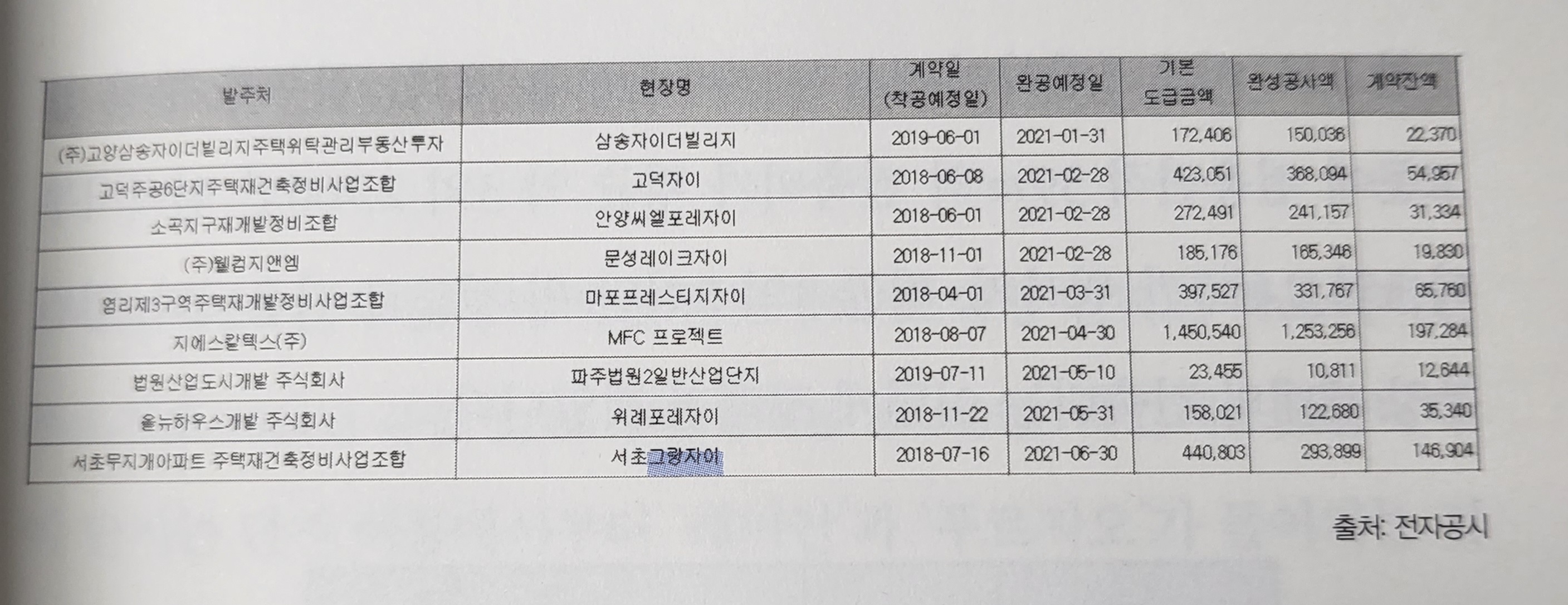 이를 피할 수 있는 방법은 전자공시 사이트(dart)를 이용하는 것이다. 통합검색에 회사명 입력 - 정기공시(검색기간 10년) - 사업보고서를 클릭하면 공사비를 찾을 수 있다. 예를 들어 2021년에 준공된 '서초 그랑자이'의 건축비가 궁금하다면, 2021년 준공이므로 GS건설의 2020년 사업보고서를 보면 된다. 여기서 <II. 사업의 내용> 부분에 '서초그랑자이'를 검색해보면 아래와 같은 표를 볼 수 있다.