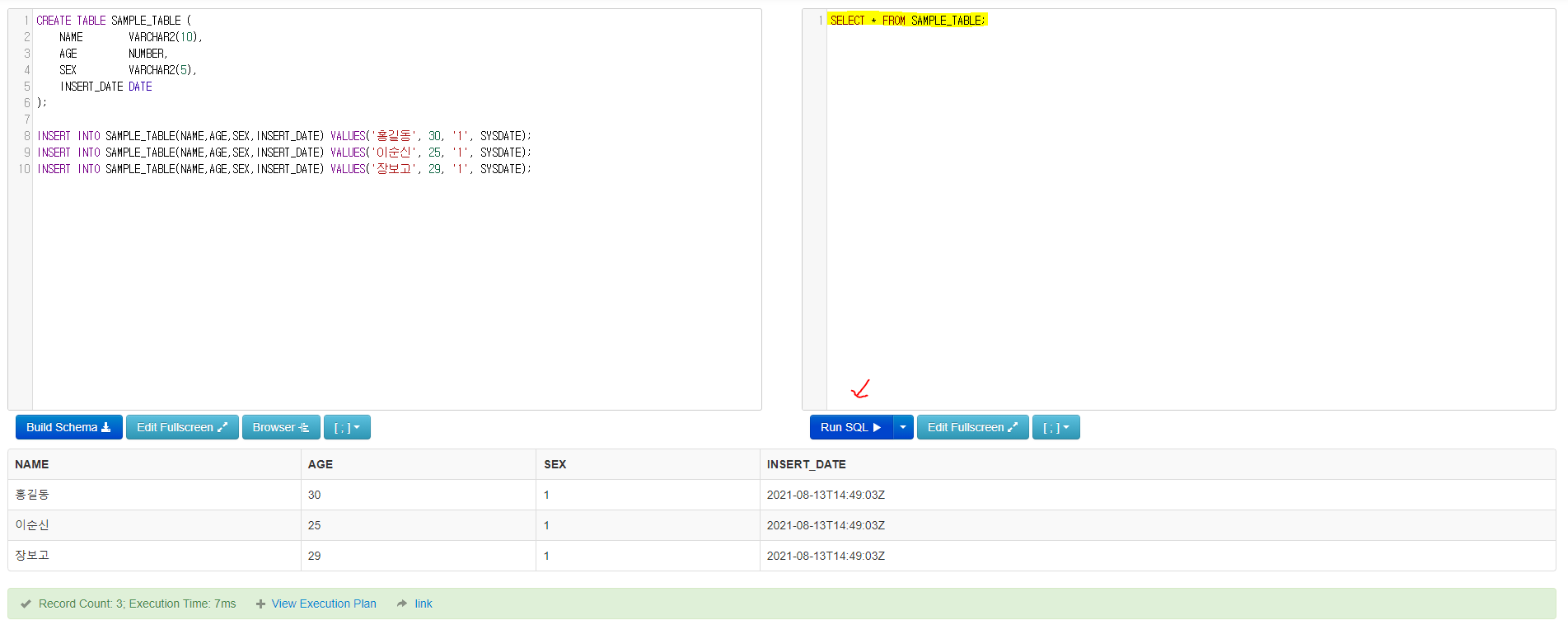 3. [우측화면] SQL 쿼리문 입력 후 Run SQL 클릭