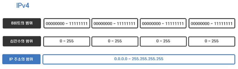 - IPv4 : 32비트(8비트X4자리) = 2^32개