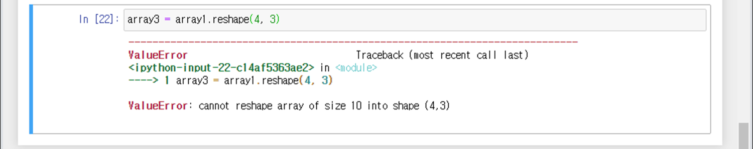 지정한 차원과 크기로 변경하지 못하면 오류 발생시킨다. 배열 요소의 개수가 정확하게 일치해야 한다.