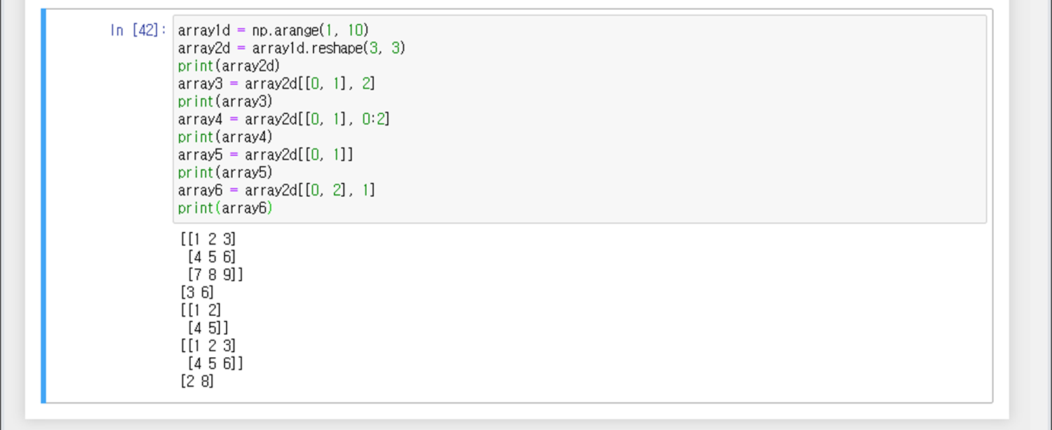 array2d[[0, 1]] 의 경우, 0행과 1행 전부를 출력하는 것이므로 2x3 행렬이 된다.