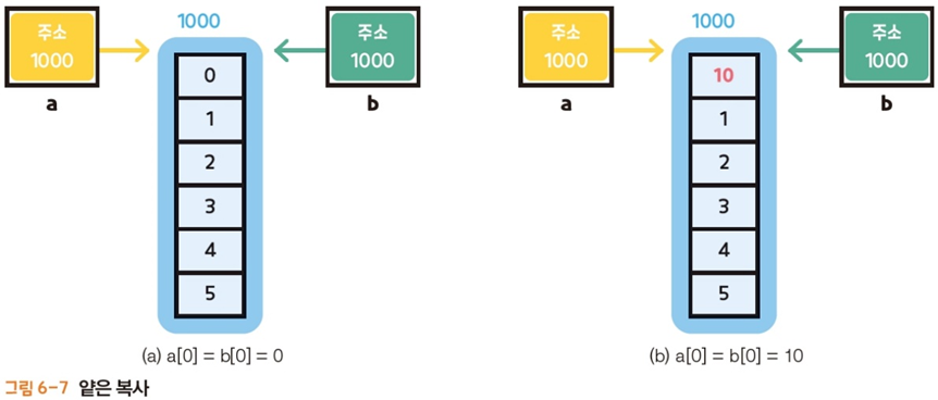 (L7~8) b의 0번값을 10으로 변경 후 a 배열 출력시 바뀐것을 확인할 수 있음