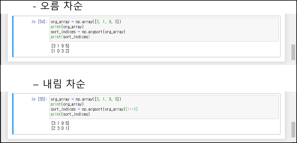 변수 = np.argsort(*)[::-1] : *1차원 넘파이 행렬을 내림차순 정렬 후 해당하는 인덱스를 반환