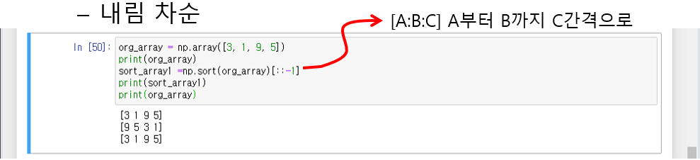 변수 = np.sort(*)[::-1] : *넘파이 행렬을 내름차순 정렬한 결과를 변수에 저장