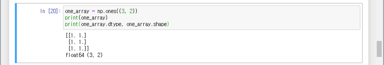 np.ones((a,b), dtype='자료형') : a행 b열 넘파이 배열을 '자료형' 타입으로 1행렬 생성 (자료형 미입력시 기본 float64)