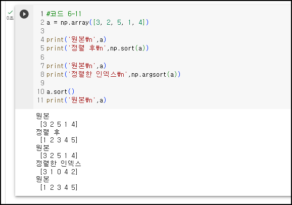 변수 = np.sort(*) : *넘파이 행렬을 오름차순 정렬한 결과를 변수에 저장