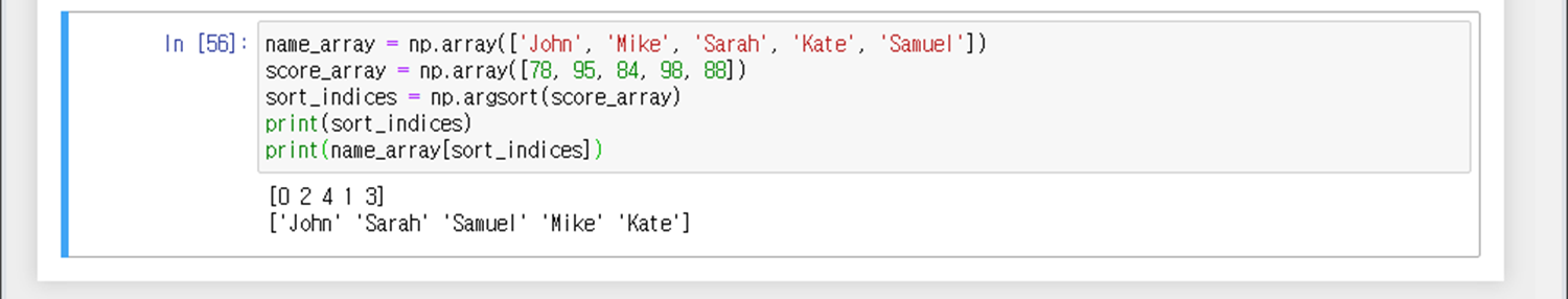 위 예시는 반 학생의 이름과 점수를 각각 array로 만들어주고, 점수를 오름차순한 결과를 인덱스로 sort_indices 변수로 리턴받는다. 그 인덱스에 해당하는 이름을 출력하게 되면, 낮은점수 순으로 반 학생의 이름을 출력할 수 있다.