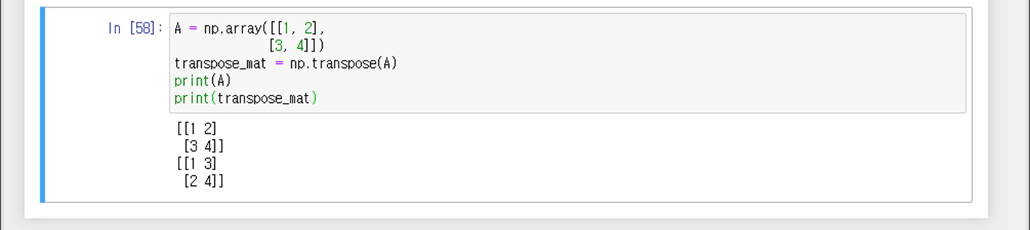 변수 = np.transpose(A) : 행렬 A를 전치행렬(Transpose)하여 그 결과를 변수에 저장