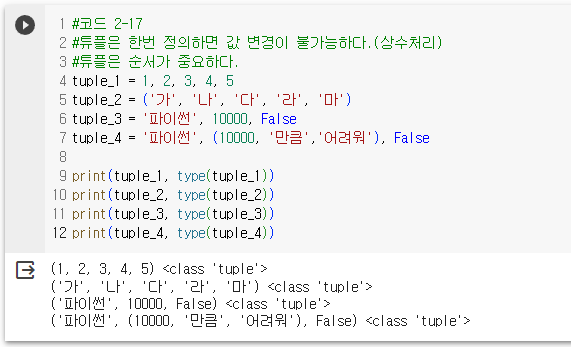 - 튜플은 순서가 있는 데이터 목록으로, 순서가 중요하다.