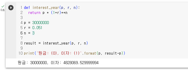 print('원금: {0}, 이자: {1}'.format(p, result-p))