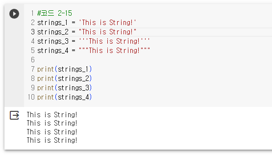 string_5 = "This is String! \"따옴표\" 기호:!@#$%^" #따옴표 표시를 위해서 이스케이프문자 필요함