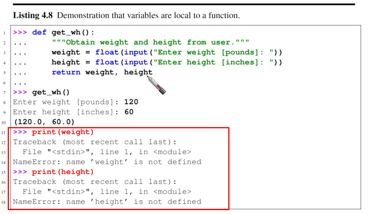 로컬변수인 weight와 height를 함수 바깥에서 출력하려고 하면 변수가 정의되지 않았다는 에러를 띄운다.