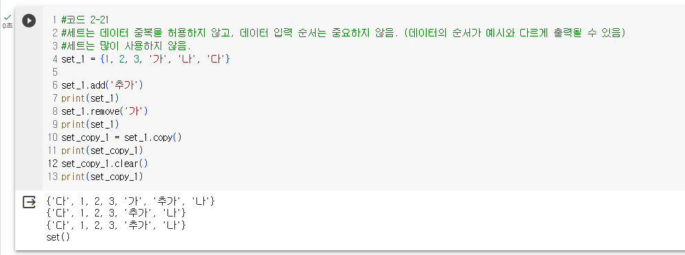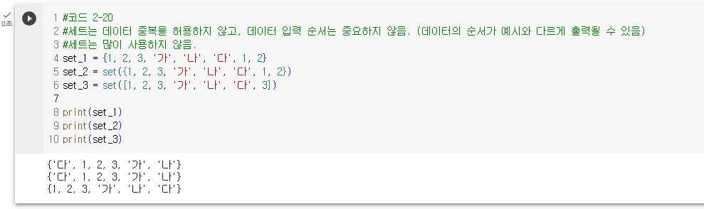 - 세트는 순서가 중요하지 않다. (데이터의 순서가 예시와 다르게 출력될 수 있다.)