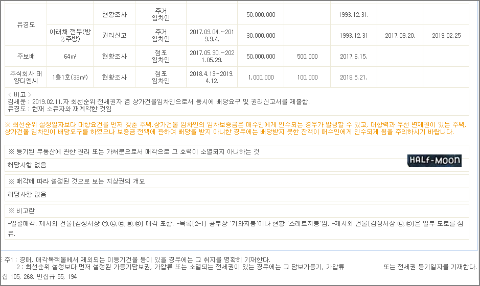 - 낙찰받으면 소멸기준(2019년 4월 17일)부터 시간순서대로 낙찰금액을 나눠서 먹는다. 임차인의 확정일자가 소멸기준보다 빠르므로 1순위로 나눠먹는다. 예를 들어, 20억에 건물이 낙찰 될 경우 홍광희씨가 1빠로 13억원을 먹고 3번부터 나머지금액을 먹음. (3번에서 나머지 7억 먹으면, 3번 남은돈 8억과 4번이후 채권자들은 다 나가리되서 소멸됨) 실질적으로 건물을 20억에 낙찰 받은 것이나 마찬가지임. (단, 대항력이 있는 보증금의 100%를 다 배당받지 못하더라도 낙찰자가 나머지 금액을 물어줘야 한다.)