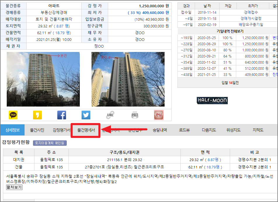- 이것도 역시 다른건 보지말고 경매에 나온 매물의 '물건명세서'만 본다.