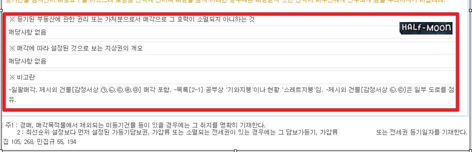 물건명세서에서 아래 3개만 깨끗하면 된다. '해당사항없음'이라고 안적혀있으면 그냥 뒤로가기 눌러라. 아래 3개에 해당사항이 없으면 낙찰대금으로 건물에 모든 채무관계를 해결한다는 뜻이다. (낙찰금액으로 알아서들 하시고 돈 못받은 사람들은 나가리)