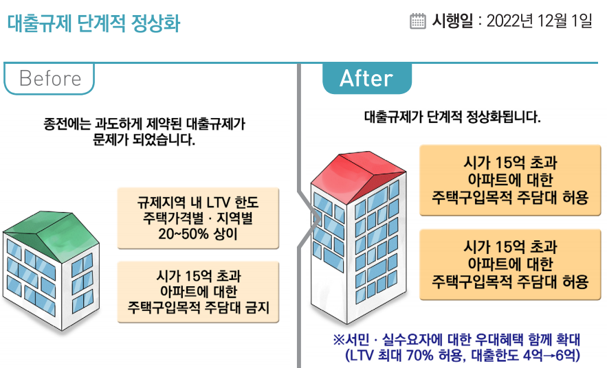 2022년 12월 1일부로 아래와 같이 부동산 대출 규제가 완화되었으니, 참고바란다.