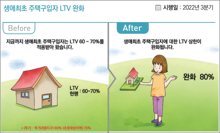 2022년 6월 1일부로 생애최초의 경우, LTV 80%까지 대출 가능함(DSR 40%는 유지된 상태임).