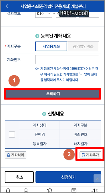 7. 계좌 입력 - '신청하기'