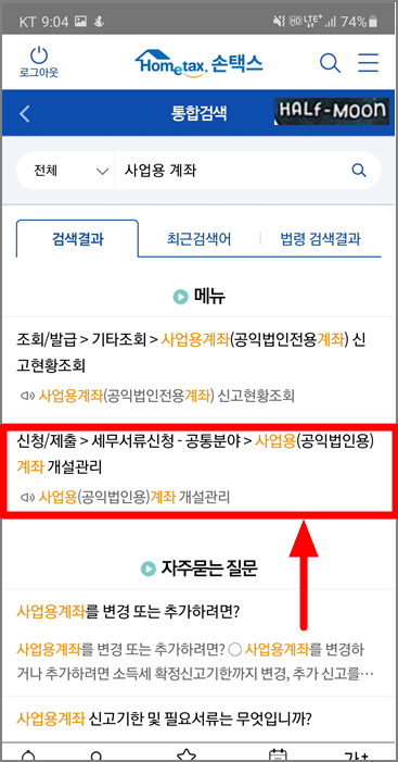 3. 검색창에 '사업용 계좌' 입력 - 검색